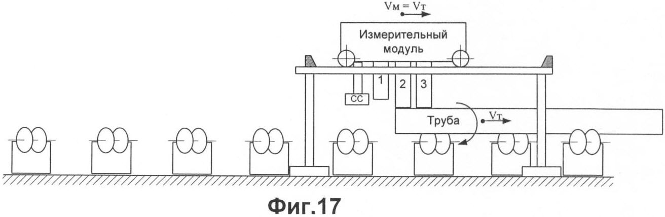 В тот момент, когда АП2 окажется на заднем конце трубы, измерительный модуль начинает движение со скоростью, равной скорости трубы (фиг.17).