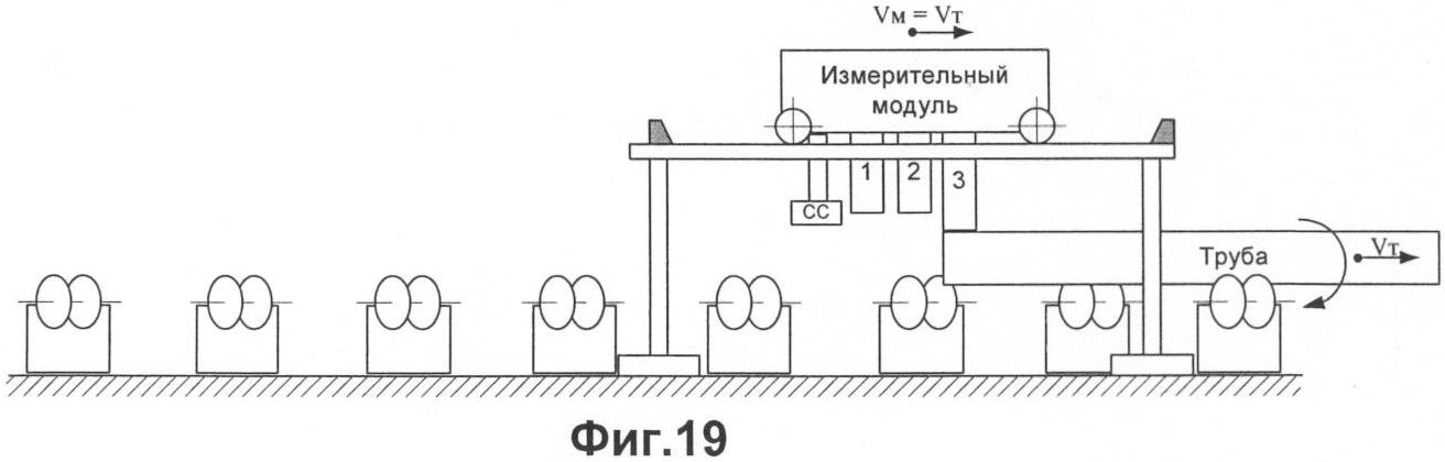 В тот момент, когда АП3 окажется на заднем конце трубы, измерительный модуль начинает движение со скоростью, равной скорости трубы (фиг.19).