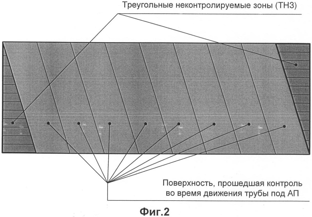 Если посмотреть на развертку трубы, проконтролированной таким образом, то отчетливо видны треугольные неконтролируемые зоны. Причем, как на переднем, так и на заднем конце трубы (фиг.2).
