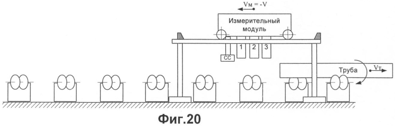Фиг.20 – проконтролированная труба транспортируется рольгангом далее по технологическому циклу. Измерительный модуль возвращается в исходное положение.