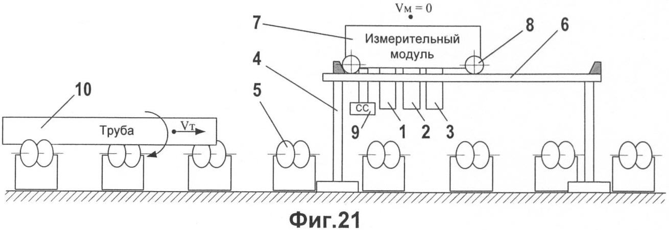 После возврата в исходное положение измерительный модуль останавливается и ожидает следующую трубу для проведения УЗК (фиг.21). Устройство (фиг.21) содержит один или n – акустических преобразователей АП 1, 2, 3 n, раму 4, рольганг 5, направляющие 6, по меньшей мере, один измерительный модуль 7, установленный на каретку 8, систему слежения 9 за перемещением трубы 10, а также механизмы перемещения трубы 10 по рольгангу 5, измерительного модуля 7 по направляющим 6, подъема и опускания АП 1, 2, 3 n (механизмы условно не показаны).