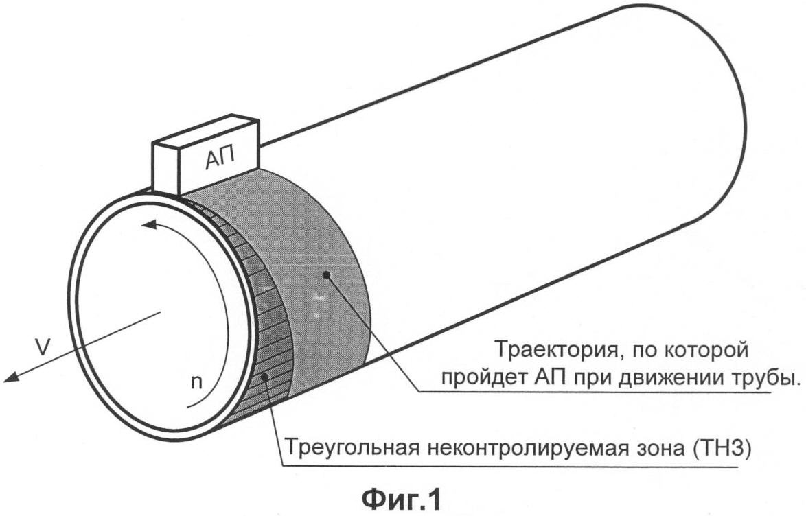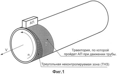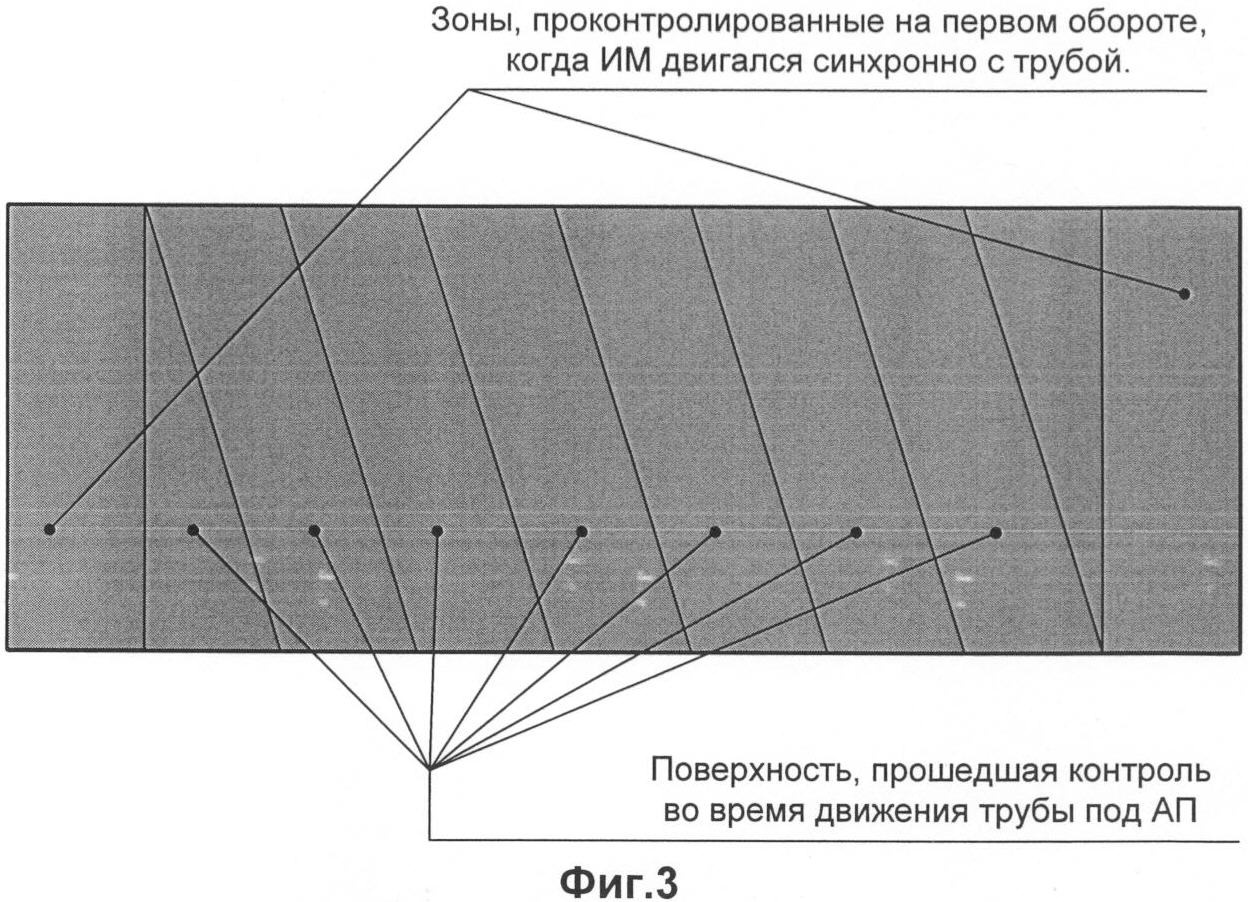 Способ заключается в том, что акустические преобразователи (АП), в количестве от одного до “n”, имеют возможность перемещаться вдоль трубы, синхронно с трубой. Для этого АП закрепляются на измерительном модуле (ИМ), который перемещается по рельсам при помощи электропривода с частотным управлением. Скорость перемещения ИМ по рельсам – регулируемая и автоматически подстраивается под поступательную скорость трубы. При этом удается избежать смещения АП относительно трубы на первом обороте трубы. Это полностью устраняет треугольную неконтролируемую зону. Развертка проконтролированной таким образом трубы выглядит так, как показано на фиг.4.