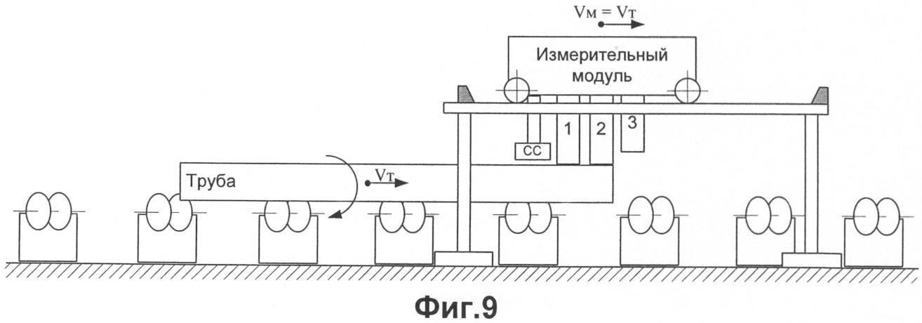С этого момента контроль акустическим преобразователем АП1 ведется по спирали, до тех пор, пока труба не окажется передним концом в точке опускания АП2. После опускания АП2 на трубу измерительный модуль начинает движение со скоростью, равной скорости трубы (фиг.9).