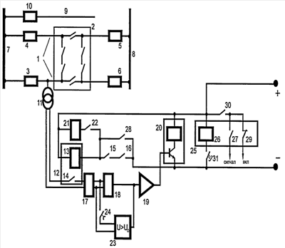 Итак, если напряжение U от трансформатора напряжения 11 больше Uo, то подается команда на выходное реле 20 через усилитель 19 и далее происходит включение выключателя 3 через контакты 30 и 29.