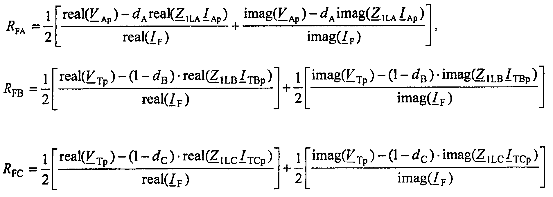 Предпочтительно, для трехтерминальных линий электропередачи сопротивления RFA, RFB, RFC в месте повреждения определяют из следующих уравнений: