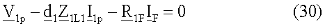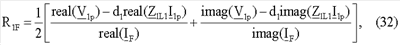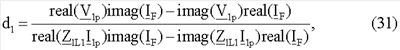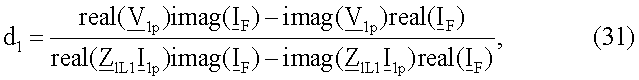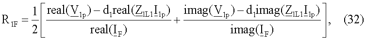 Уравнение (30) записывают отдельно для действительной части и для мнимой части, и выполняют дальнейшие математические преобразования, получают уравнения для искомого расстояния до точки повреждения (31) и для сопротивления в месте повреждения (32).