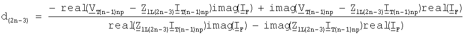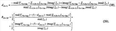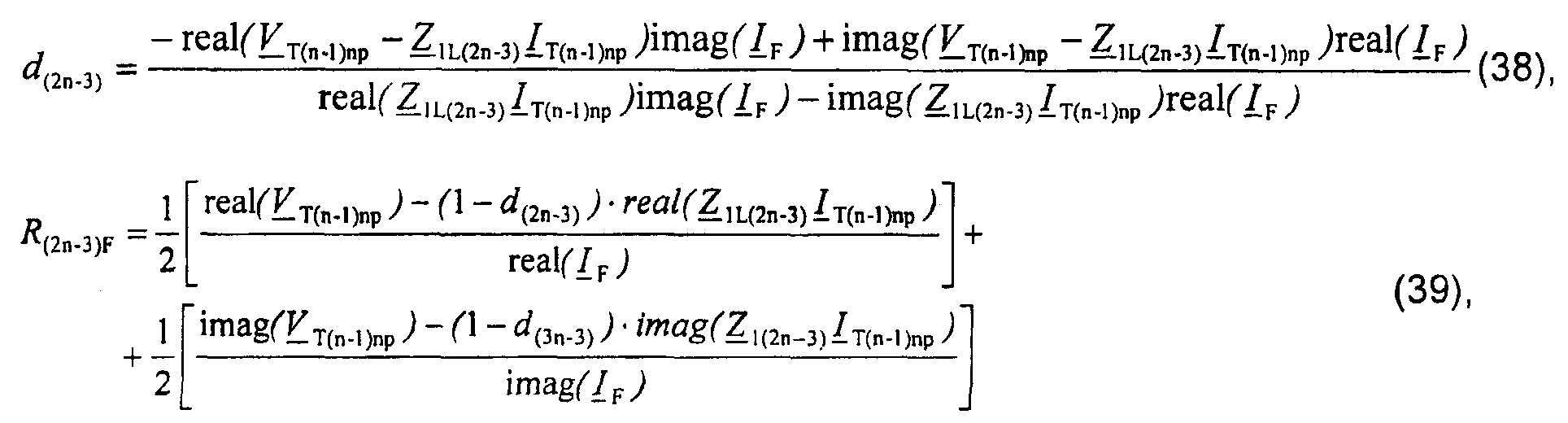 Уравнение (37) записывают отдельно для действительной части и для мнимой части и выполняют дальнейшие математические преобразования, получают решения (38) для искомого расстояния d(2n-3) до точки повреждения и для сопротивления R(2n-3)B в месте повреждения:
