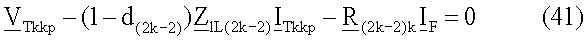 где Vlp – напряжение на контуре повреждения, вычисляемое в предположении, что повреждение произошло на участке L1 линии; Ilp – контурный ток повреждения, вычисляемый в предположении, что повреждение произошло на первом участке L1 линии; VT(n-1)np – напряжение на контуре повреждения, вычисляемое в предположении, что повреждение произошло на участке L(2n-3) линии; IT(n-1)np – контурный ток повреждения, вычисляемый в предположении, что повреждение произошло на участке L(2n-3) линии; VTkkp – напряжение на контуре повреждения, вычисляемое в предположении, что повреждение произошло в koй линии передачи с ответвлениями; ITkkp – контурный ток повреждения, вычисляемый в предположении, что повреждение произошло в koй линии передачи с ответвлениями; VTkT(k+1)p – напряжение на контуре повреждения, вычисляемое в предположении, что повреждение произошло на участке линии между двумя точками ответвления; ITkT(k+1)p – контурный ток повреждения, вычисляемый в предположении, что повреждение произошло на участке линии между двумя точками ответвления; IF – полный ток повреждения; ZlLl – импеданс участка L1 линии для положительной последовательной составляющей; Z0Ll – импеданс участка L1 линии для нулевой последовательной составляющей; ZlL(2n-3) – импеданс участка L(2n-3) линии для положительной последовательной составляющей; Z0L(2n-3) – импеданс участка L(2n-3) линии для нулевой последовательной составляющей; ZlL(2k-2) – импеданс участка L(2k-2) линии для положительной последовательной составляющей; Z0L(2k-2) – импеданс участка L(2k-2) линии для нулевой последовательной составляющей; ZlL(2k-1) – импеданс участка L(2k-1) линии для положительной последовательной составляющей; Z0L(2k-1) – импеданс участка L(2k-1) линии для нулевой последовательной составляющей; k – номер точки ответвления; n – номер терминала линии.