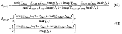 Уравнение (40) записывают отдельно для действительной части и для мнимой части, и выполняют дальнейшие математические преобразования, получают решения (42) для искомого расстояния d(2k-3) и до точки повреждения и (43) для сопротивления R(2k-3)B в месте повреждения: