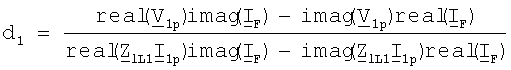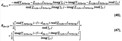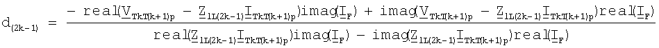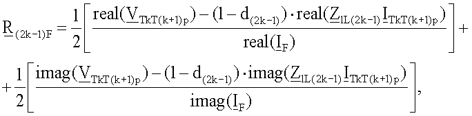 Уравнение (45) записывается отдельно для действительной части и для мнимой части и выполняют дальнейшие математические преобразования, получают решения (46) для искомого расстояния d(2k-1) до точки повреждения и (47) для сопротивления R(2k-1)F в месте повреждения: