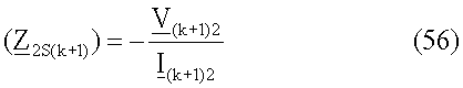 11′. Вычисляют импеданс (Z2Sk) и (Z2S(k+1)) эквивалентных источников в предположении, что повреждение расположено на участке линии между двумя точками ответвления Tk-T(k+1) (действия выполняют в операциях 660d):