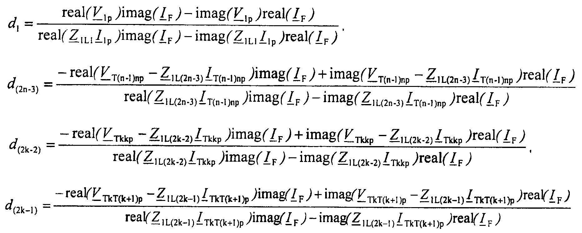 где (d1) – расстояние до повреждения от начала линии до точки повреждения; (d(2n-3)) – расстояние до повреждения от конца линии до точки повреждения; (d(2k-2))- расстояние до повреждения от конца линии передачи с ответвлениями до точки повреждения; (d(2k-1))- расстояние до повреждения на участке линии между двумя точками ответвления; V1p – напряжение на контуре повреждения, вычисляемое в предположении, что повреждение произошло на первом участке L1 линии; I1p – контурный ток повреждения, вычисляемый в предположении, что повреждение произошло на первом участке L1 линии; VT(n-1)np – напряжение на контуре повреждения, вычисляемое в предположении, что повреждение произошло на участке L(2n-3) линии; IT(n-1)np – контурный ток повреждения, вычисляемый в предположении, что повреждение произошло на участке L(2n-3) линии; VTkkp – напряжение на контуре повреждения, вычисляемое в предположении, что повреждение произошло в koй линии передачи с ответвлениями; ITkkp – контурный ток повреждения, вычисляемый в предположении, что повреждение произошло в koй линии передачи с ответвлениями; VTkT(k+1)p – напряжение на контуре повреждения, вычисляемое в предположении, что повреждение произошло на участке линии между двумя точками ответвления; ITkT(k+1)p – контурный ток повреждения, вычисляемый в предположении, что повреждение произошло на участке линии между двумя точками ответвления; IF – полный ток повреждения; ZlLl – импеданс участка L1 линии для положительной последовательной составляющей; Z0Ll – импеданс участка L1 линии для нулевой последовательной составляющей; ZlL(2n-3) – импеданс участка L(2n-3) линии для положительной последовательной составляющей; Z0L(2n-3) – импеданс участка L(2n-3) линии для нулевой последовательной составляющей; ZlL(2k-2) – импеданс участка L(2k-2) линии для положительной последовательной составляющей; Z0L(2k-2) – импеданс участка L(2k-2) линии для нулевой последовательной составляющей; ZlL(2k-1) – импеданс участка L(2k-1) линии для положительной последовательной составляющей; Z0L(2k-1) – импеданс участка L(2k-1) линии для нулевой последовательной составляющей; k – номер точки ответвления; n – номер терминала линии.