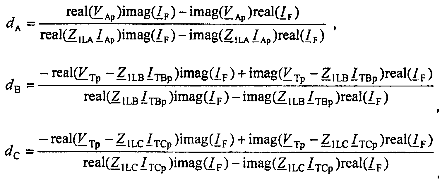 imag обозначает мнимую часть заданной величины; VAp – обозначает напряжение на контуре повреждения, определяемое в предположении, что повреждение произошло на участке LA; VTp – обозначает напряжение на контуре повреждения, определяемое в предположении, что повреждение произошло на участке LB или LC; IAp – обозначает контурный ток повреждения, определяемый в предположении, что повреждение произошло на участке LA; ITBp – обозначает контурный ток повреждения, определяемый в предположении, что повреждение произошло на участке LB; ITCp – обозначает контурный ток повреждения, определяемый в предположении, что повреждение произошло на участке LC линии; IF – обозначает полный ток повреждения; Z1LA=R1LA+j 1L1LA – обозначает импеданс участка LA линии для положительной последовательной составляющей; Z1LB=R1LB+j 1L1LB – обозначает импеданс участка LB линии для положительной последовательной составляющей; Z1LC=R1LC+j 1L1LC – обозначает импеданс участка LC линии для положительной последовательной составляющей; RlLA, RlLB, RlLC – сопротивление для положительной последовательной составляющей для участков LA, LB, LC линии соответственно; L1LA, L1LB, L1LC – индуктивность для положительной последовательной составляющей для участков LA, LB, LC линии соответственно;