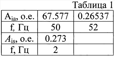 Для проверки работоспособности предложенного способа определения скольжения первый датчик сигнала 1 (ДС1) подключили к фазе А статора питания универсального асинхронного двигателя с фазным ротором (2p=4, nc=1500 об/мин), второй датчик сигнала 6 (ДС2) подключили ко фазе В статора, третий датчик сигнала 7 (ДС3) подключили к фазе С статора. Одновременно регистрировали мгновенные значения токов ia, ib, ic статора в установившемся режиме функционирования асинхронного двигателя в течение 1 с. (фиг.2, фиг.3, фиг.4). Используя полученные значения в программаторе определения модуля результирующего вектора тока статора 2 (ПМРВТС), определили модуль результирующего вектора тока статора (фиг.5) по выражению (1). В программаторах дискретного преобразования Фурье 3 (ПДПФ1) и 8 (ПДПФ2) одновременно провели дискретное преобразование Фурье модуля результирующего вектора тока статора и тока ia питания фазы А обмотки статора и получили амплитудно-частотные характеристики модуля результирующего вектора тока статора в диапазоне частот от 0 до 50 Гц и тока ia питания фазы А обмотки статора. Зависимость амплитуды модуля результирующего вектора тока статора Ais, о.е. от частоты f, Гц приведена на фиг.6. Зависимость амплитуды тока одной из фаз питания Aia, о.е. от частоты f, Гц приведена на фиг.7. В таблице 1 представлены наибольшие амплитуды токов и соответствующие им частоты. Далее в программаторах выделения основной частоты 4 (ПОЧ1) и 9 (ПОЧ2) выделили основную частотную составляющую fs0=2 Гц модуля результирующего вектора тока статора и основную составляющую с наибольшей амплитудой потребляемого тока с частотой fc=50 Гц. Выделенные частоты fs0 и fc передали в программатор определения скольжения 5 (ПС), где определили скольжение ротора s,
