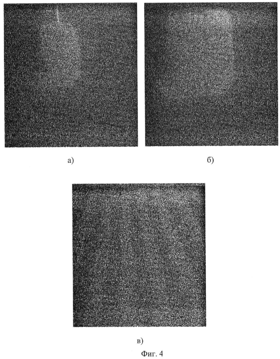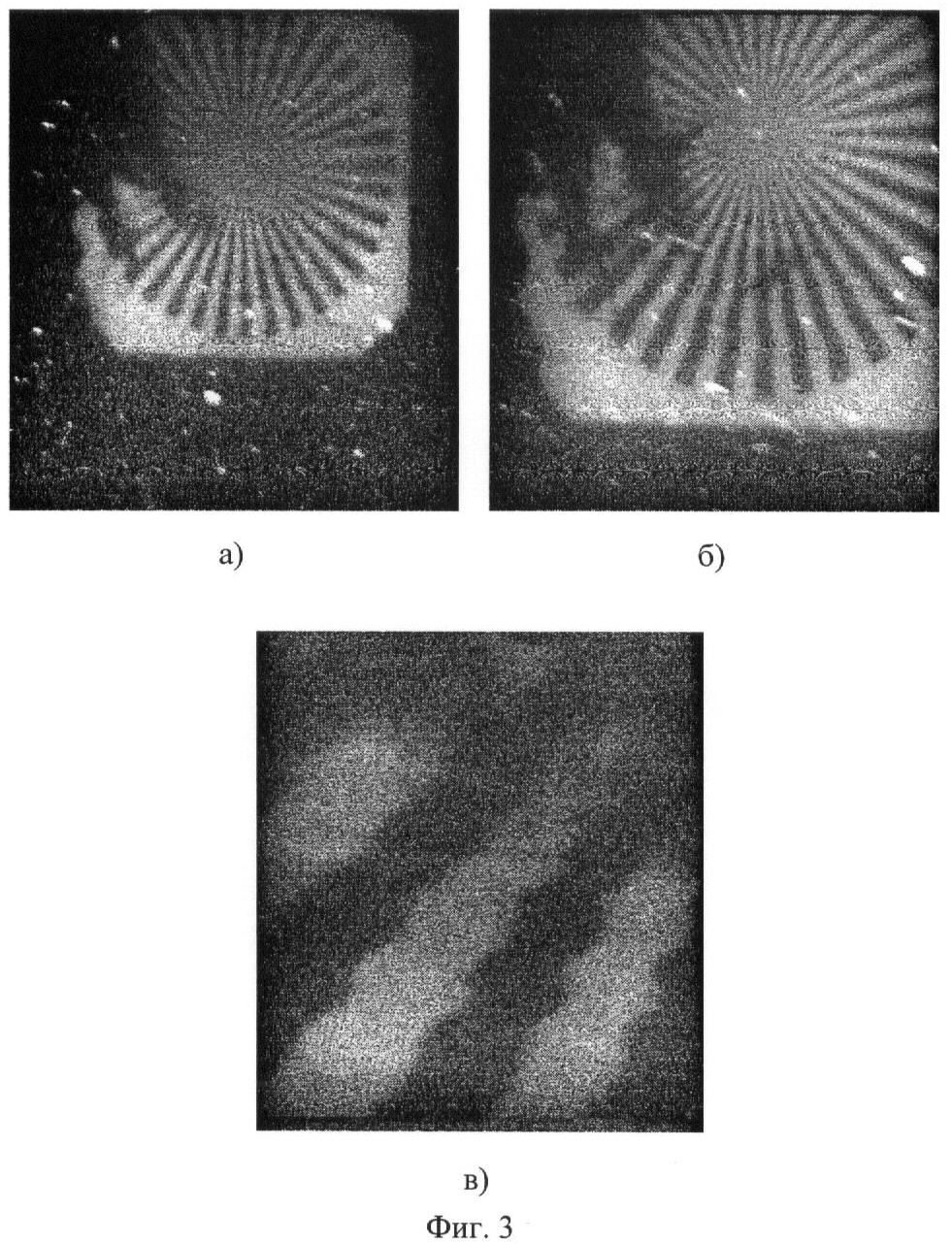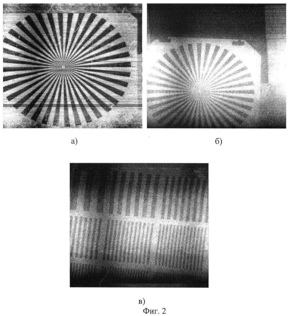 На Фиг.2 представлены изображения оптической миры, зондируемой с расстояний 15, 25, 27 м в искусственном бассейне с чистой водой, где Zб составляло 30 м. Съемка проводилась при полном отсутствии естественной освещенности (в затемненном бассейне). Детали миры отчетливо просматривались, диаметр «кружка невидимости» при LД=25 м составлял приблизительно 5 см, что соответствует разрешению R~2 см-1. Это означает, что объект с размером 5 мм различался на дальности 25 м.