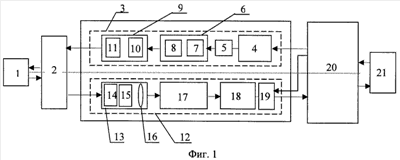 На Фиг.1 представлена схема устройства для реализации способа видения подводных объектов, где: 1 – объект, 2 – среда распространения, 3 – передающий канал, 4 – источник зондирующего излучения, 5 – телескоп, 6 – устройство сканирования, 7 – акустооптический дефлектор в режиме сканирования по координате Y, 8 – акустооптический дефлектор в режиме сканирования по координате X, 9 – выходная оптическая система, 10 – фокусирующий объектив, 11 – объектив-трансфокатор, 12 – приемный канал, 13 – входная оптическая система, 14 – интерференционный фильтр, 15 – поляризационный фильтр, 16 – линза, 17 – фотоприемное устройство с узлом стробирования, 18 – усилитель, 19 – пиковый детектор, 20 – автоматическая система управления и обработки информации, 21 – пульт оператора.
