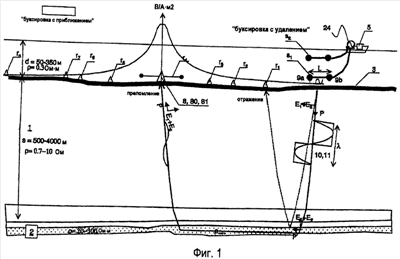 – буксировку излучающих первое и второе переменные поля Е1, Е2 источников s1 и s2 на первой и второй глубинах ниже поверхности моря или на высотах h1, h2 выше морского дна 3, и при этом первое поле Е1 имеет первую фазу 1;