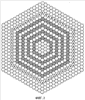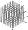 Пример 2. Из штабиков круглого сечения из стекла 2 (табл.2) с показателем преломления 1.86, из стекла 10 (табл.4) с показателем преломления 1.52 и из стекла 3 (табл.3) вытянуты дроты круглого сечения диаметром 1.10 мм. Из трубки из стекла 10 (табл.4), заполненной оловом вытянуты капилляры с оловянным заполнением с внешним диаметром 1.10 мм. Из полученных дротов набран пакет с двойной апофемой 30 мм и длиной 400 мм. В пакете сформирована брегговская структура с мягкой защитной оболочкой. Сердцевина и низкопреломляющие и защитная оболочки набраны из стекла 10 (табл.4), светопоглощающая оболочка – из стекла 3 (табл.3). Пакет перетянут в шестигранный дрот с двойной апофемой 1.10 мм, поперечное сечение которого схематически показано на Фиг.4. Затем из полученного таким образом дрота, исходных дротов круглого сечения из стекла 10 (табл.4) и электродных капилляров был набран вторичный пакет с двойной апофемой 8.7 мм и перетянут в несколько преформ с размером апофемы 3-4 мм, поперечное сечение которых схематически показано на Фиг.3, и далее преформы перетягивали в волокно диаметром 100-300 мкм, причем во время перетяжки на одну из пар электродов подавалось электрическое напряжение от 30 до 60 вольт.