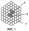 На Фиг.3 показан поперечный разрез вторичного пакета, где 6 – дрот с брегговской структурой, 7 – дроты мягкой обкладки из стекла с низкой вязкостью в температурном интервале вытяжки волокна, 8 – электроды, выполненные в виде двух пар, примыкающие к дроту брегговской структуры с диаметрально противоположных сторон.