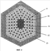 На Фиг.4 показан поперечный разрез дрота с брегговской структурой, оболочки которой имеют форму шестиугольников, вытянутых в направлении одной из диагоналей. Высокопреломляющие оболочки могут быть выполнены не сплошными, а содержать вставки из низкопреломляющего стекла. На Фиг.4: 9 – сердцевина, элементы которой выполнены из низкопреломляющего лазерного стекла, 10 – элементы высокопреломляющей оболочки, 11 – элементы из низкопреломляющего стекла, в том числе в виде вставок в высокопреломляющую оболочку, 12 – вставки из высокопреломляющего светопоглощающего стекла в периферийной оболочке, 13 – мягкая обкладка данного дрота.