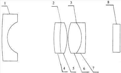 Объектив содержит отрицательный мениск 1, обращенный выпуклостью к предмету, и два двояковыпуклых компонента 2 и 3, причем компонент 2 склеен из положительного мениска 4 и двояковыпуклой линзы 5, а компонент 3 склеен из двояковыпуклой линзы 6 и отрицательного мениска 7. В оптическом расчете объектива принято во внимание защитное стекло 8 приемного устройства (например, ПЗС-матрицы). Мениск 1 изготовлен из особого крона ОК-4, имеющего показатель преломления ne<1,50 и аномальную дисперсию e>85, что позволяет ему работать в более широком спектральном диапазоне (0,4-0,95 мкм), исправлять вторичный спектр и тем самым уменьшить аберрации.