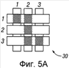 В кадре, показанном на фиг.5A, пиксели (1,1), (1,2), (2,2), (3,2) и (3,3) активированы. Для этого в течение “времени линии” для строки 1 на столбцы 1 и 2 подают -5 Вольт, и на столбец 3 подают +5 Вольт. Это не приводит к изменению состояния ни одного из пикселей, поскольку все пиксели остаются в окне стабильности 3-7 Вольт. Затем строку 1 стробируют импульсом, который меняется от 0 до 5 Вольт, а затем возвращается к нулю. Это активирует пиксели (1,1) и (1,2) и деактивирует пиксель (1,3). Никакие другие пиксели в матрице не подвергаются влиянию. Для установки по желанию строки 2 на столбец 2 подают -5 Вольт, и на столбцы 1 и 3 подают +5 Вольт. Подача того же стробирующего сигнала на строку 2 приведет к активации пикселя (2,2) и деактивации пикселей (2,1) и (2,3). Опять же никакие другие пиксели матрицы не подвергаются воздействию. Строку 3 аналогичным образом устанавливают, подавая на столбцы 2 и 3 напряжение -5 Вольт и на столбец 1 – напряжение +5 Вольт. Стробирующий сигнал строки 3 устанавливает пиксели строки 3, как показано на фиг.5A. После записи кадра потенциалы строк равны нулю, и потенциалы столбцов могут оставаться равными +5 или -5 Вольт, и дисплей остается стабильным в конфигурации, показанной на фиг.5A. Очевидно, что ту же процедуру можно применять для матриц из дюжин или сотен строк и столбцов. Также очевидно, что хронирование, последовательность и уровни напряжения, используемые для осуществления активации строк и столбцов, можно варьировать в широких пределах согласно изложенным выше общим принципам, и вышеприведенный пример носит исключительно иллюстративный характер, и описанные здесь системы и способы позволяют использовать любой метод активации напряжением.