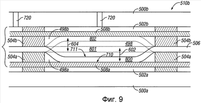 Помимо этих этапов другой слой или другая опорная часть 504b добавляется (например, осаждается) поверх подвижного слоя 506. Таким образом, формируется вторая, верхняя полость 498b на другой стороне подвижного слоя 506 относительно нижней полости 498a. Как очевидно специалисту в данной области, полость при изготовлении содержит расходуемый материал, что более подробно описано выше. Расходуемый материал удаляется после того, как сверху осаждены другой(ие) слой(и). Дополнительно, с подвижным слоем 506 соединяется вторая отражающая поверхность 711. После этого добавляется еще один слой 508b диэлектрика и затем добавляется второй частично отражающий слой 502b. Наконец, поверх второй опорной части 504b или поверх опорной стопки 510 можно добавить вторую подложку 500b (например, путем осаждения), например, из SiO2. Альтернативно, вторую подложку 500b можно присоединить к устройству с использованием эпоксидной смолы. Согласно предпочтительному варианту осуществления эпоксидная смола является по существу оптически прозрачной. Вторую подложку можно присоединить непосредственно ко второму частично отражающему слою 502b или к дополнительным опорным частям, как показано на фиг.9.