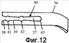 На фиг.12 показана металлическая боковина 36 из пружинного материала со щелевым углублением 37, выполненным на конце, обращенном к линзе, коническим установочным проемом 38, двумя щелевыми коническими участками 39, 40, каждый из которых оканчивается расширяющимся углублением 41, 42, и концевым углублением 43. Углубления 41, 42 используются для удержания резьбовых штифтов 5, 6 несущего элемента 1 и служат местами фиксации при надевании боковины на несущий элемент при замене деталей очковой оправы.