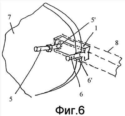 На фиг.1-3 показаны три различных, смещенных на 90° относительно друг-друга вида несущего элемента 1, который прикреплен с видимой стороны очковой линзы или очковой оправы. Несущим элементом 1 является имеющий форму носителя металлический компонент с поперечным сечением в форме протяженной перекладины 3 и стержня 4, имеющего такую же протяженность, что и перекладина 3. Из стержня 4 выходят винтовой штифт 5 и находящийся на определенном расстоянии от него установочный штифт 6 или другой винтовой штифт 6 с несущим элементом 1 на нижней стороне перекладины 3, причем стержень винтового штифта 5, так же как установочного штифта 6, имеет диаметр, который превышает поперечное сечение стержня 4. Резьбовый штифт 5 пропущен сквозь отверстие 5′(фиг.6) в очковой линзе 7 и затем укорачивается в соответствии с толщиной линзы, после чего резьбовый штифт закрепляют посредством гайки. Установочный штифт 6 вставляют в неполное отверстие 6′, открытое на краю линзы, так что расположение несущего элемента 1 на линзе четко определяется. В качестве альтернативы аналогичным образом сквозь очковую линзу может быть пропущен другой резьбовый штифт 6. Длина несущего элемента определяется расстоянием между двумя штифтами 5, 6, причем отверстие для резьбового штифта находится на достаточно безопасном расстоянии от края линзы, так что предотвращается повреждение линзы под воздействием сверления и напряжения.