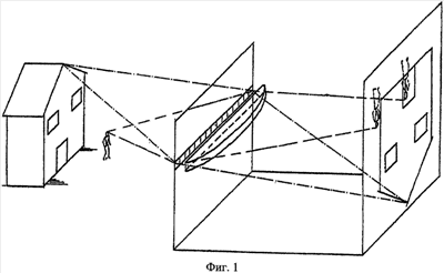 На фиг.1 схематически показан дом с человеком перед ним. Изображена камера с последовательным рядом обтюраторов, линзой и сигнальной пластиной. Можно видеть, что фокусированным объектом является дом и что человек находится ближе к камере, чем дом. Можно видеть, как лучи света, приходящие от одной из точек дома, конька крыши, сходятся в одной точке пластины, когда они проходят через два различных обтюратора. Однако фигура человека перед домом создает два различных изображения для двух различных обтюраторов, другими словами, для двух различных точек вида.