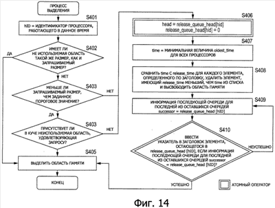На этапе S408 менеджер 313 области памяти (модуль управления кучей) сравнивает время запроса на высвобождение (release_time), установленное в каждом компоненте, отслеживаемом от каждого заголовка, с минимальным из самых старших времен входа, установленных в списке потоков, соответствующих всем процессорам, имеющим время [time], установленное на этапе S407, и выбирает только запрашиваемое время высвобождения (release_time), которое меньше, чем величина [time]. Менеджер 313 области памяти (модуль управления кучей) удаляет выбранное запрашиваемое время высвобождения [release_time] из очереди высвобождения, высвобождает области памяти, соответствующие этим очередям, и выделяет высвобожденные области памяти для потока, запрашивающего память.