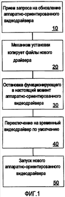 Фиг. 1 является блок-схемой способа обновления аппаратно-ориентированного драйвера дисплея без перезагрузки. На этапе 10 операционная система может обнаружить, что пользователь запросил обновление драйвера дисплея. Пользователь может создать такой запрос, например, посредством загрузки обновленного драйвера дисплея из сети в память на главном компьютере или выгрузки обновленного драйвера в память на главном компьютере с CD.