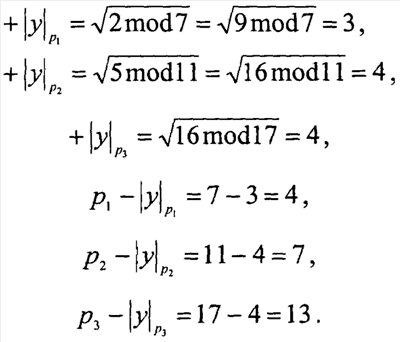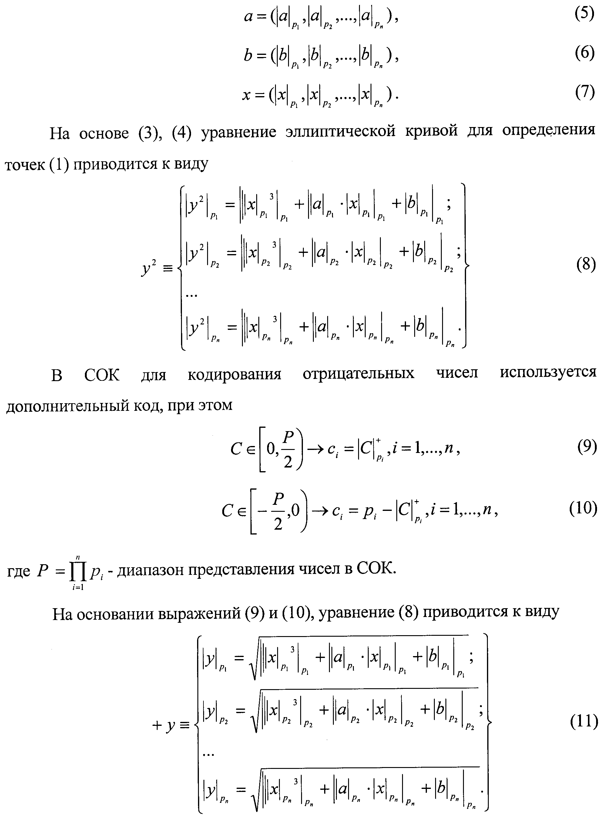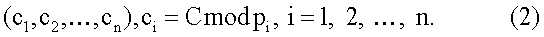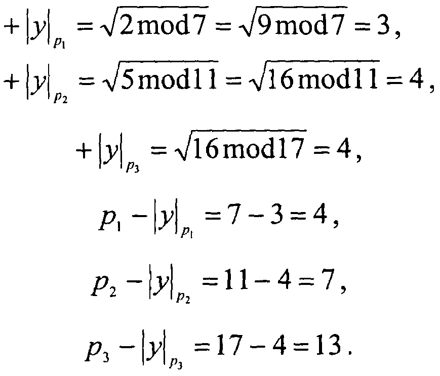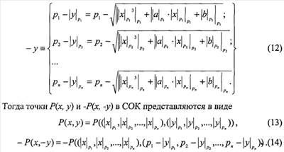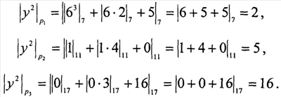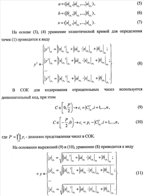 Для достижения требуемого уровня безопасности используются ключи шифрования (а,b) размером 100-250 бит, т.е. 2100-2250. Большая размерность обрабатываемых данных обуславливает низкую скорость определения точек и в целом скорости шифрования на современной вычислительной базе. Для уменьшения размерности обрабатываемых данных и повышения скорости определения точек предлагается применить СОК. В СОК, имея набор взаимно-простых чисел или модулей р1, р2, , рn, любое число С представляется в виде кортежа небольших вычетов