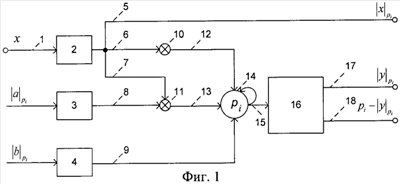 Для перевода переменной х по i-му модулю из позиционной системы счисления в СОК согласно (7) в изобретении используется КНСКК 2 (патент 2317584). Для хранения заранее вычисленных констант и согласно (5), (6) используется ПЗУ 3 и 4 соответственно.