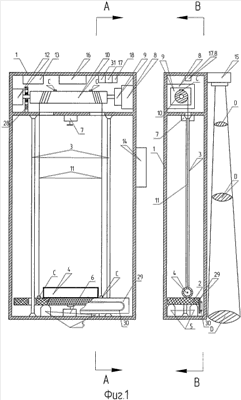 В момент переключения перекидного контакта коммутационного элемента 17 и его замыкания с нормально разомкнутым контактом, подключенным к общей шине устройства ( ), образуется цепь питания и стабилизации тока двигателя 8: выход стабилизатора тока «ВЫХ«СТ» источника питания 13 – нормально замкнутые контакты коммутационного элемента 18 – якорь двигателя 8 и общая шина. При этом ось двигателя 8 начинает вращаться, приводя в движение и выходной вал редуктора 9 (с передаточным коэффициентом, свойственным конкретному типу редуктора 9), рабочий вал 10 также приходит в движение, наматывая на себя тросы 11. Вращение вала 10 заставляет подвижную платформу 2 с закрепленными на ней детектором ионизирующего излучения 4 и панелью 29 (с блоком антенн 30) перемещаться по направляющим 3 вверх до момента срабатывания датчика 7 фиксации верхней точки подъема подвижной сканирующей платформы 2. При этом стабильность и плавность ее движения определяются величиной и стабильностью тока в цепи питания двигателя 8, формируемого управляемым стабилизатором тока блока питания 13, а скорость движения платформы 2 (в данном случае вверх) – конкретным значением тока на выходе «ВЫХ «СТ», задаваемого первоначальной (исходной) установкой, определяемой параметрами электродвигателя, редуктора и диаметром рабочего вала 10, а также местом нахождения платформы 26 в пространстве, контролируемом датчиком-энкондером12.