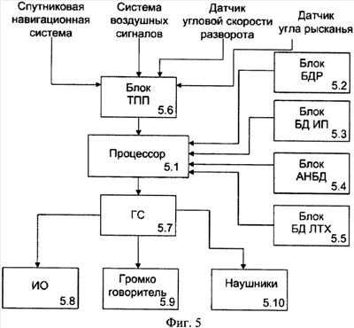 Заявленный способ предупреждения столкновения вертолета с препятствиями реализуется устройством, структурная схема которого показана на фиг.5. Устройство содержит процессор 5.1, к которому подключены блоки БДР 5.2, БД ИП 5.3, АНБД 5.4 и БД ЛТХ 5.5, блок текущих параметров полета (ТПП) 5.6. Выходы процессора 5.1 подключены к входу генератора электрических сигналов (ГС) 5.7, выходы которого подключены к входам соответствующего индикаторного оборудования (ИО) 5.8 и аудиоустройств 5.9 и 5.10. От спутниковой навигационной системы типа GPS или ГЛОНАСС блок ТПП 5.6 поучает данные о текущих координатах ЛА, а именно о широте и долготе, геометрической высоте полета, вертикальной скорости, путевой скорости и путовом угле. Также данные о текущих параметрах полета вертолета поступают в блок ТПП 5.6 от датчиков воздушной скорости, угловой скорости разворота и датчика угла рысканья. Процессор 5.1 на основании полученных данных рассчитывает параметры защитных зон, далее по вычисленным параметрам и полученным данным о высотах и координатах препятствий выделяет те препятствия, которые попадают в пределы указанных зон. Среди них выделяет ЭП, рассчитывает для него параметры уклонения по высоте, вертикальной скорости или путевой скорости, которые индицируют на соответствующих шкалах на экране индикатора. Также о препятствиях, находящихся в пределах защитных зон, пилот информируется соответствующими текстовыми сообщениями на экране индикатора и дублирующими голосовыми сообщениями, которые подаются на наушники 5.10 или транслируются через кабинный громкоговоритель 5.9.