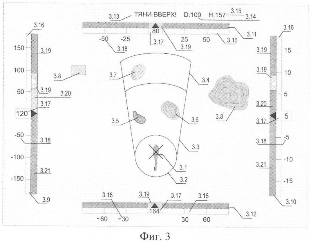 Каждая из шкал высоты 3.9, вертикальной скорости 3.10, путевой скорости 3.11 и путевого угла 3.12 имеет неподвижный оцифрованный индекс 3.17, расположенный посередине, на котором отображено текущее значение высоты в метрах, вертикальной скорости в метрах в секунду, путевой скорости в километрах в час и путевого в градусах соответственно. Деления шкал 3.16 рассчитывают относительно неподвижного индекса текущего значения 3.17. Единицы деления 3.18 пропорциональны текущему значению соответствующей шкалы и имеют относительную размерность. Подвижный символ 3.19 указывает на заданное командное значение при маневре уклонения. Также на шкалах указывают рекомендуемый 3.20 диапазон изменения величины зеленым цветом, разрешенный 3.21 – желтым и запрещенный 3.22 – красным.