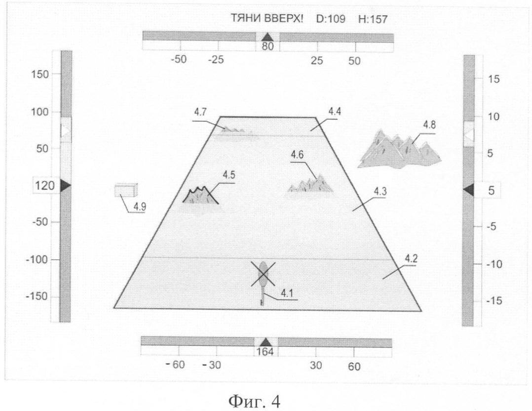 На фиг.4 изображены силуэт вертолета 4.1, контуры зон столкновения 4.2, управления 4.3 и внимания 4.4, экранные координаты точек сечения которых, так же как и координаты положения препятствий 4.5-4.9, вычисляют в виде нелинейных функций реальных координат. Из всех препятствий отображают только те, чья высота превышает опорную плоскость, параллельную плоскости движения, опущенную на величину hm. Их высота соответствует превышению над опорной плоскостью, а цвет определяют по типу зоны, в которой они находятся. Выборочный вывод препятствий на экран дисплея позволяет избежать избыточности информации на экране, и, как следствие, помогает пилоту быстрее ориентироваться и адекватно оценивать текущую ситуацию. Искусственные препятствия 4.9 рисуют в виде контуров. В памяти бортового вычислителя хранят некоторое количество шаблонов, применяемых для отображения типовых искусственных препятствий, таких как здания, башни/вышки, ЛЭП, ВПП и др. Если ресурсы памяти и вычислительного блока достаточны, то отдельные объекты отображают в виде фотореалистичных ЗD-моделей, созданных в специализированных программах и хранимых в соответствующей библиотеке объектов.