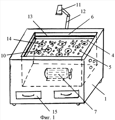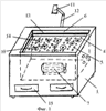 Открывают крышку 2. Осуществляют юстировку прибора путем регулировки положения пластины для обеспечения ее точного горизонтального положения. Для этих целей в приборе предусмотрено регулировочное устройство (на чертеже не показано), установленное в корпусе 1. Устанавливают видеокамеру 11. При этом объектив видеокамеры должен быть обращен на пластину 4 и обеспечивать показ изображения всей поверхности пластины. Включают вентилятор 7. При этом через отверстия 8 в боковой стенке корпуса 1 из атмосферы засасывается воздух, направляемый под пластину 4. Возникает избыточное давление, под действием которого воздух через отверстия 5 в пластине 4 идет вверх – эффект воздушной подушки. В результате рабочие тела 10 (модели частиц вещества, в частности молекул) парят над пластиной 4, хаотично перемещаясь. Установленные по периметру пластины 4 магнитные полосы 13 и закрепленные на поверхности рабочих тел 10 постоянные магниты 14 обеспечивают моделирование взаимодействия молекул. Видеокамера передает изображение процесса хаотичного движения моделей молекул на компьютер, где полученное изображение обрабатывается на компьютере и воспроизводится (проецируется) либо на монитор, либо на экран через видеопроектор.