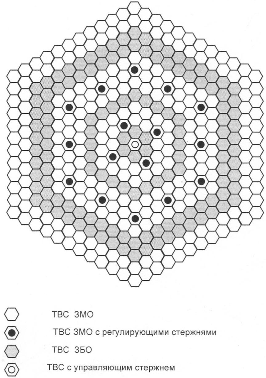 Для реализации тонкого управления в ряде ТВС, расположенных в ЗМО, часть твэлов заменяются на полую металлическую трубку цилиндрической формы (приемный цилиндр), в которую необратимым образом в течение реакторной кампании вводится регулирующий стержень из соединения 238U (в твердом состоянии), так чтобы обеспечить постоянство энерговыделения реактора. Нижний конец у приемного цилиндра расположен в нижней плоскости активной зоны реактора, высота приемного цилиндра примерно равна удвоенной высоте активной зоны реактора. Для “идеального” цилиндрически симметричного реактора приемные цилиндры равномерно (по азимутальной координате) заполняют цилиндрический слой (несколько слоев) в зоне (зонах) малого обогащения. Для реального реактора оптимальная область расположения приемных труб определяется расчетно-экспериментальным путем, так чтобы обеспечить равномерность энерговыделения по активной зоне в течение всей кампании. Пример расположения приемных цилиндров представлен на чертеже.