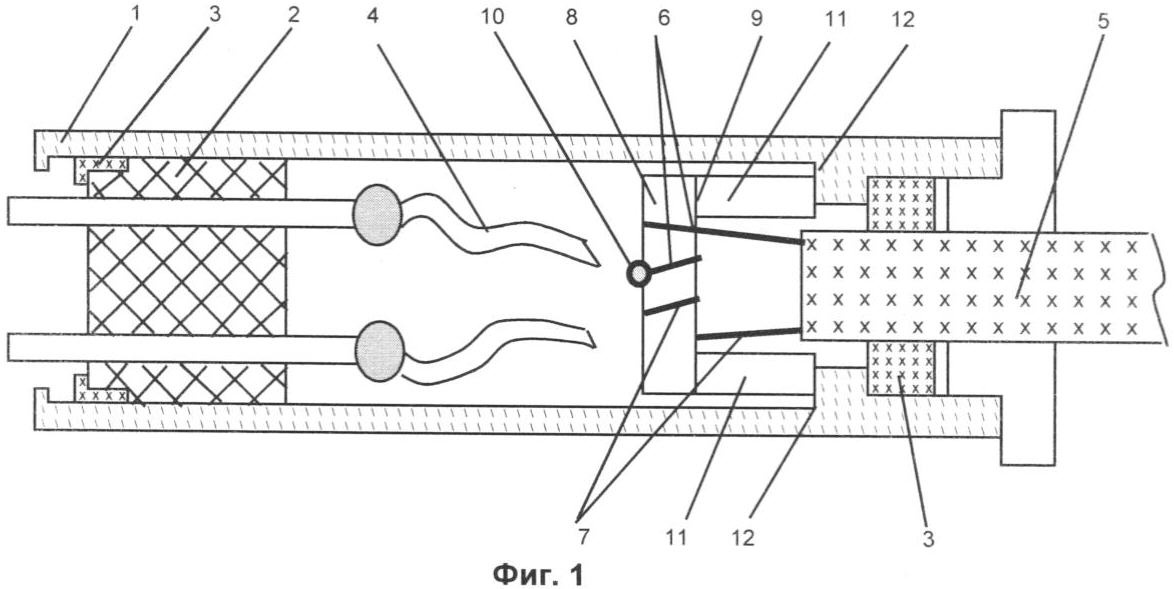 Устройство работает следующим образом. При приложении продольных растягивающих усилий к армированному кабелю 5 (кабель вытягивают из полумуфты) нагрузка, через пучки нитей 6 и 7, передается на узел крепления 9 грузонесущего элемента, а также на место соединения 10 (например, «прямой» узел) пучков 6 и 7, пропорционально распределяясь между данными элементами конструкции. При этом стойки 11 узла крепления 9 упираются в выступ 12 на корпусе 1, что ограничивает осевое перемещение узла крепления 9. Круговое (вращательное) перемещение узла крепления 9 исключается за счет встречной намотки пучков 6 и 7 на цилиндрическую часть 8 узла крепления 9. За счет того, что пучки 6 и 7 намотаны на цилиндрическую часть 8 без перекрытия, исключается их передавливание, то есть не снижаются прочностные характеристики данных пучков. Место соединения 10 пучков 6 и 7 является, с точки зрения прочностных характеристик, наиболее «слабым» местом данной конструкции, т.к. элементарные нити пучков 6 и 7 претерпевают в этом месте наибольший изгиб. Однако, за счет того, что значительная часть нагрузки перераспределяется с места соединения 10 пучков на фиксатор 9, обеспечивается существенное повышение разрывной прочности изделия в целом по сравнению с известными изделиями аналогичного назначения.