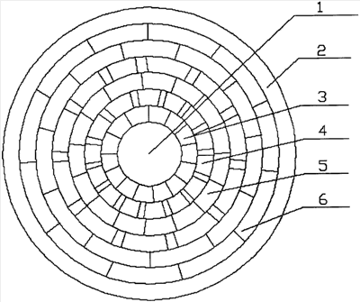 На фиг.1 представлена конструкция коаксиального кабеля. Она содержит центральный проводник 1, расположенный на нем один слой пористой полимерной изоляции 2 и внешний проводник 3, n-1 пористые перфорированные слои изоляции 4, 5, 6, при этом каждый из n слоев пористой полимерной изоляции перфорирован по всей длине с различными шагами перфорации в каждом слое и различными размерами отверстий перфорации в каждом слое.