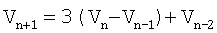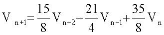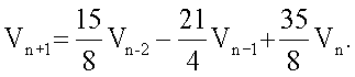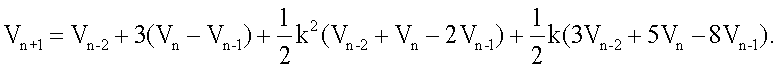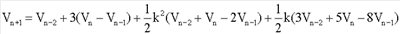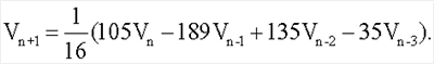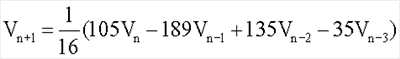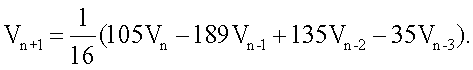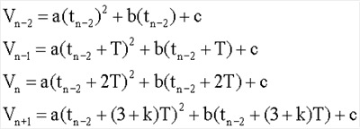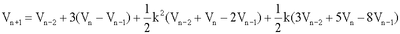 Удаляя произвольные числа a, b и c, а также tn-2 и T из уравнений (1) выше, значение Vn+1 оценки напряжения постоянного тока в следующее время выборки вычисляется так, как указано ниже посредством уравнения (2):