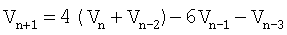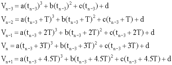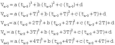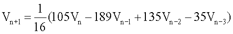 Удаляя произвольные числа a, b, c и d, а также tn-3 и интервалы выборки периода T из уравнений (3) выше, значение Vn+1 оценки напряжения постоянного тока в следующее время выборки вычисляется так, как указано посредством уравнения (4) ниже: