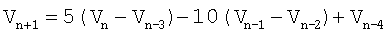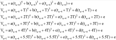Удаляя произвольные числа a, b, c, d и e, а также tn-4 и интервалы выборки периода T из уравнений (5) выше, значение Vn+1 напряжения постоянного тока в следующее время выборки вычисляется так, как указано посредством уравнения (6) ниже: