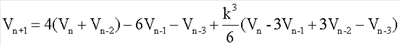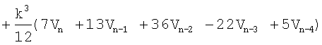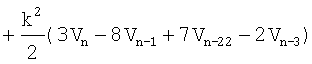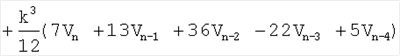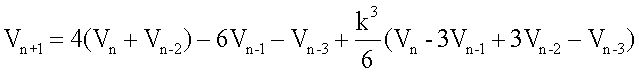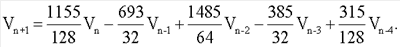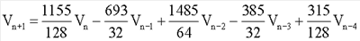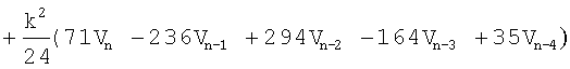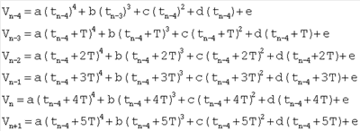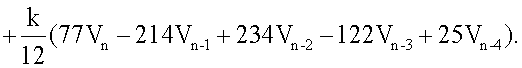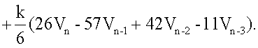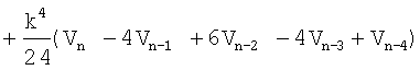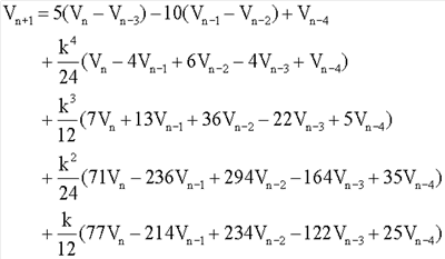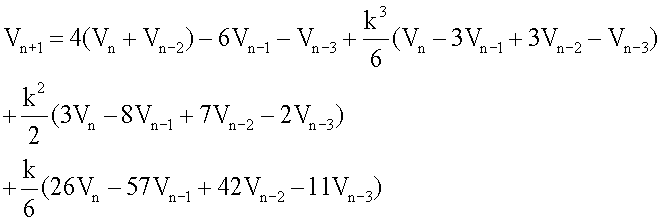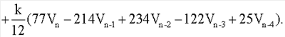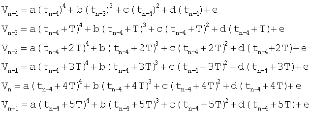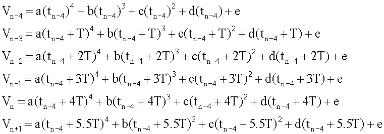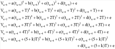 Удаляя a, b, c, d и e, а также tn-4 и T из уравнений (17) выше, значение Vn+1 оценки напряжения постоянного тока во время tn+1, сдвинутое вперед от следующего времени выборки на k×T, вычисляется так, как указано посредством уравнения (18) ниже: