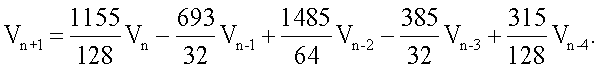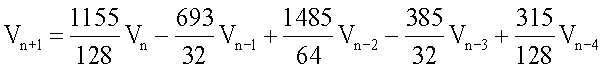 Удаляя a, b, c, d и e, а также tn-4 и T из уравнений (11) выше, значение Vn+1 оценки напряжения постоянного тока во время tn+1, сдвинутое вперед от следующего времени выборки на 0,5T, вычисляется так, как указано посредством уравнения (12) ниже: