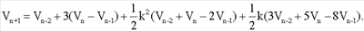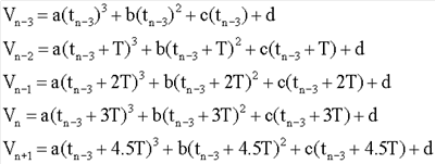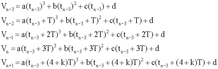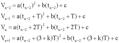 Удаляя a, b, c и d, а также tn-3 и T из уравнений (15) выше, значение Vn+1 оценки напряжения постоянного тока во время tn+1, сдвинутое вперед от следующего времени выборки на k×T, вычисляется так, как указано посредством уравнения (16) ниже: