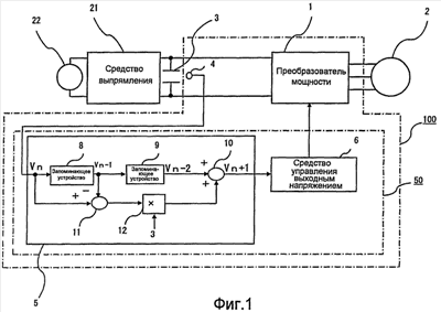 Фиг. 3 является конфигурационной схемой, показывающей один конкретный пример средства 6 управления выходным напряжением. В средстве 6 управления выходным напряжением по фиг. 3, значение Vn+1 оценки напряжения постоянного тока, оцененное посредством средства 5 оценки обнаруженного значения напряжения постоянного тока, преобразуется в значение, соответствующее фазному напряжению, посредством средства 15 коэффициента преобразования напряжения постоянного тока в фазное напряжение, и это значение преобразуется в значение, соответствующее обратной величине, посредством средства 16 преобразования в обратную величину. Значение, полученное преобразованием посредством средства 16 преобразования в обратную величину, умножается на значение сигнала управления напряжением, полученное посредством средства 17 сигналов управления частотой/напряжением, согласно сигналу управления частотой, установленному посредством средства 18 установки сигнала управления частотой, посредством умножителя 12a, чтобы тем самым вычислять коэффициент модуляции, используемый при выполнении широтно-импульсной модуляции. Оценивая напряжение постоянного тока посредством использования этого коэффициента модуляции, средство 6 управления выходным напряжением корректирует выходное напряжение преобразователя 1 мощности так, чтобы уменьшать пульсацию выходного напряжения преобразователя 1 мощности. Согласно сигналу управления частотой, установленному посредством средства 18 установки сигнала управления частотой, интегратор 19 интегрирует значения, умноженные на 2 посредством умножителя 12b, чтобы определить фазу и, согласно этой фазе, синусоидальная волна, представляющая сигнал управления трехфазным напряжением, формируется посредством генератора 20 сигнала управления синусоидальной волны трехфазного напряжения. Затем, значение, полученное посредством умножения сигнала управления синусоидальной волны трехфазного напряжения на коэффициент модуляции, используется для выходного сигнала широтно-импульсной модуляции из умножителя 12a, посредством умножителя 12c, или значение сигнала управления выходным напряжением, выводится в блок управления PWM преобразователя 1 мощности. Явление биения выходного тока преобразователя 1 мощности подавляется посредством приведения в действие преобразователя 1 мощности посредством вышеупомянутой операции управления PWM. Хотя средство 6 управления выходным напряжением вышеупомянутой конфигурации пояснено в качестве примера в первом варианте осуществления, также можно достичь того же результата посредством использования средства управления выходным напряжением на основе другого эффективного способа, такого как векторное управление.