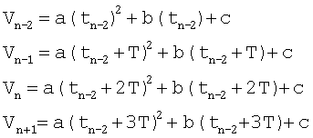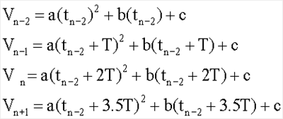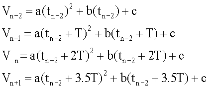 T , показанное на фиг. 2, обозначает конкретные интервалы выборки периода времени, которые могут быть произвольно установлены при разработке микрокомпьютера 50. Ниже поясняется случай, когда кривая, соединяющая значения Vn-2 с Vn+1 на фиг. 2, выражается посредством квадратической функции.